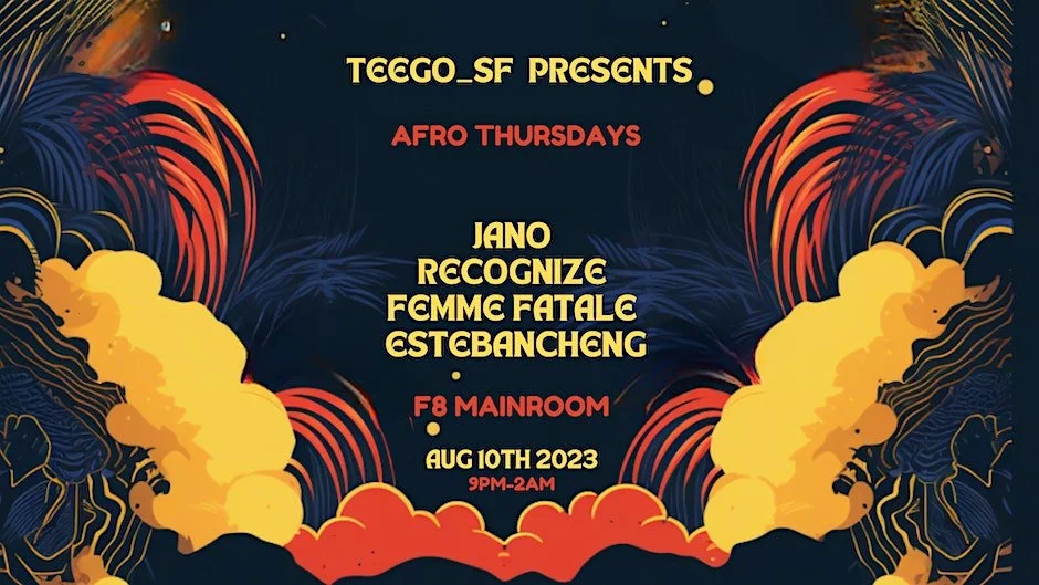 Afro House Thursdays Thursday, August 10, 2023 9:00 PM 21:00 Friday, August 11, 2023 2:00 AM 02:00 F8 1192 Folsom San Francisco United States (map) Google Calendar ICS FREE w/ RSVP b4 11pm Teego SF presentsa night of Afro HousefeaturingTeegoJanoFemme FataleEstebanchengFree w/ RSVP b4 11PM21+