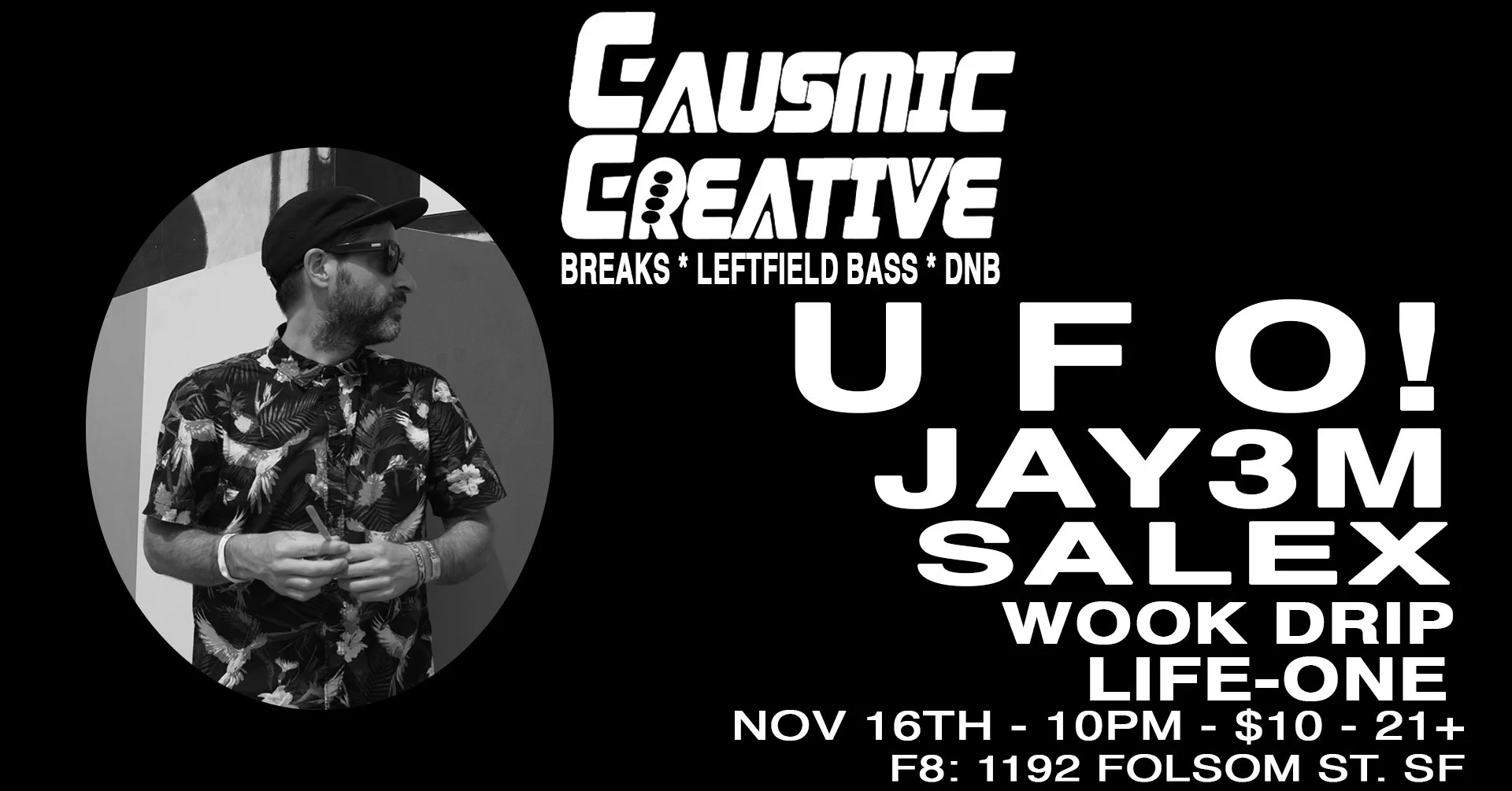 Causmic Creative ft. U F O!, JAY3M + more Thursday, November 16, 2023 9:00 PM 21:00 Friday, November 17, 2023 2:00 AM 02:00 F8 1192 Folsom San Francisco United States (map) Google Calendar ICS $10 Door Causmic Creative: Bass, Midtemp, DnBft.U F O! JAY3MSALEXWOOK DRIP (BDAY SET) LIFE-ONE$10 Door21+