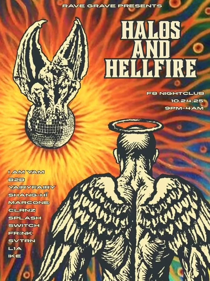 RaveGrave: Halos and Hellfire Friday, October 24, 2025 9:00 PM 21:00 Saturday, October 25, 2025 4:00 AM 04:00 F8 1192 Folsom San Francisco United States (map) Google Calendar ICS TICKETS RaveGrave presentsHalos and Hellfirea night of Tech House & Bassfeaturing:I Am Yam b2b YairyFairyclrnzFrōnkIkeL1A MarconeShang-HïSplashSvtrnSwitch_______Advanced tickets available • 21+