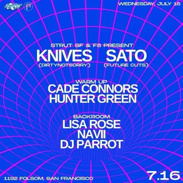 Wednesday night July 16th we welcome SF tech house heroes Knives and Sato! Support from Cade Connors and Colibri! Room 2 features Lisa Rose, Navii, and DJ Parrot! Free entry b4 11pm with RSVP! $10 at the door.