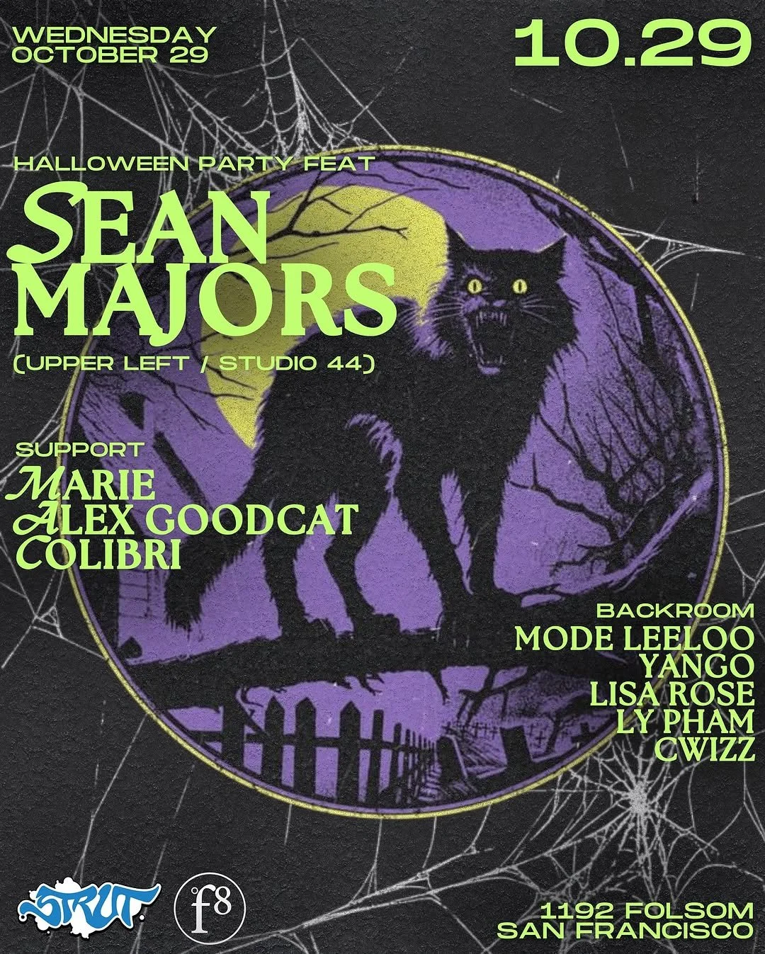 Wednesday night October 29th Strut SF and F8 Present: Halloween Party Feat Bay Area House Music mogul Sean Majors! Also featuring Marie, Alex Goodcat and Colibri! Room 2 Hosted by Mode Leeloo & friends!