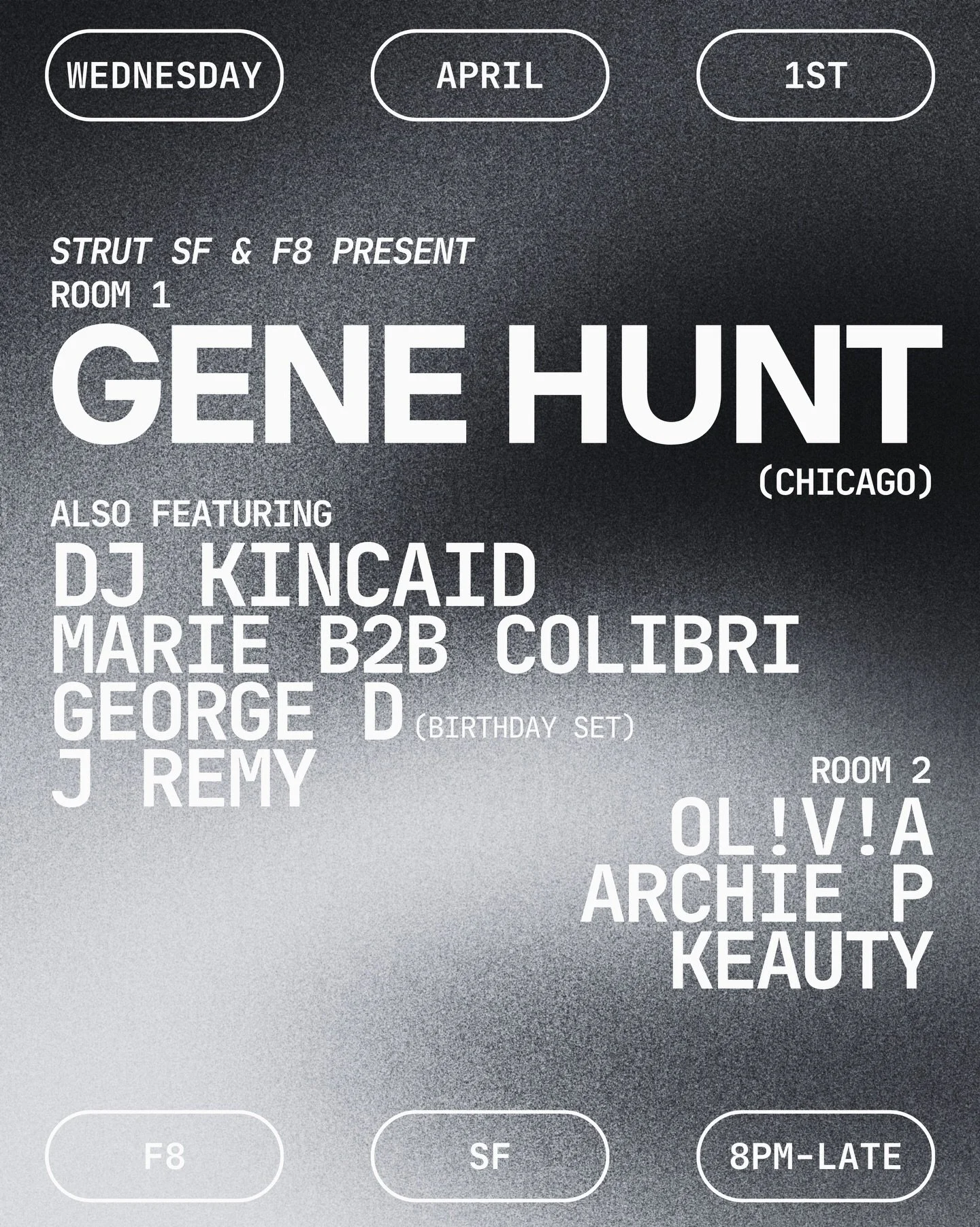 Wednesday, April 1st we welcome Chicago house music legend Gene Hunt! Direct support from DJ Kincaid, with Marie b2b Colibri warming things up. Special birthday closing set by George D, and J Remy opening for happy hour. Room 2 hosted by Ol!v!a!