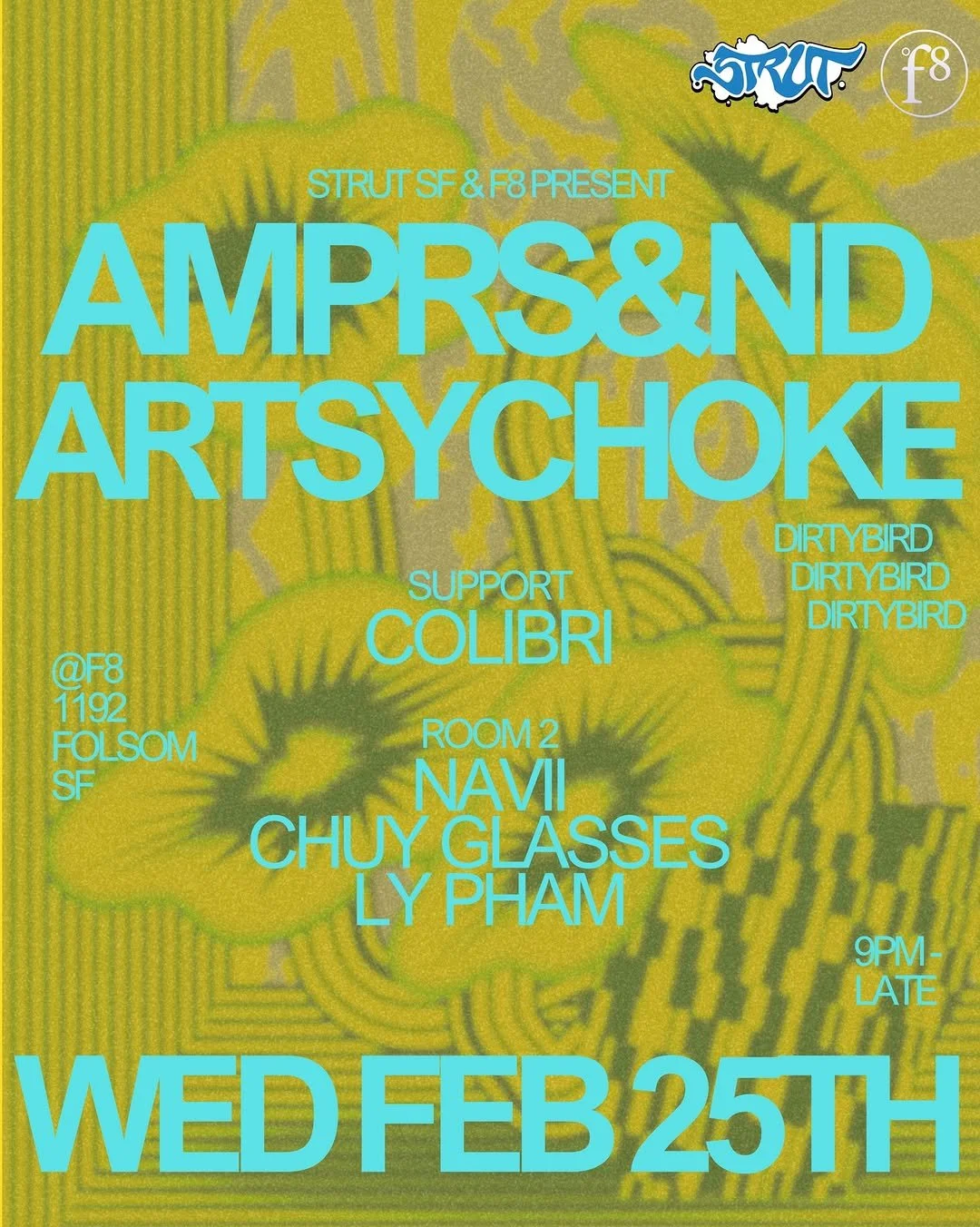 Wednesday night February 25th we welcome Dirtybird players Amprs&nd & Artsychoke for Strut SF at F8! Support from Colibri! Room 2 features Chuy Glasses, Navii & Ly Pham!